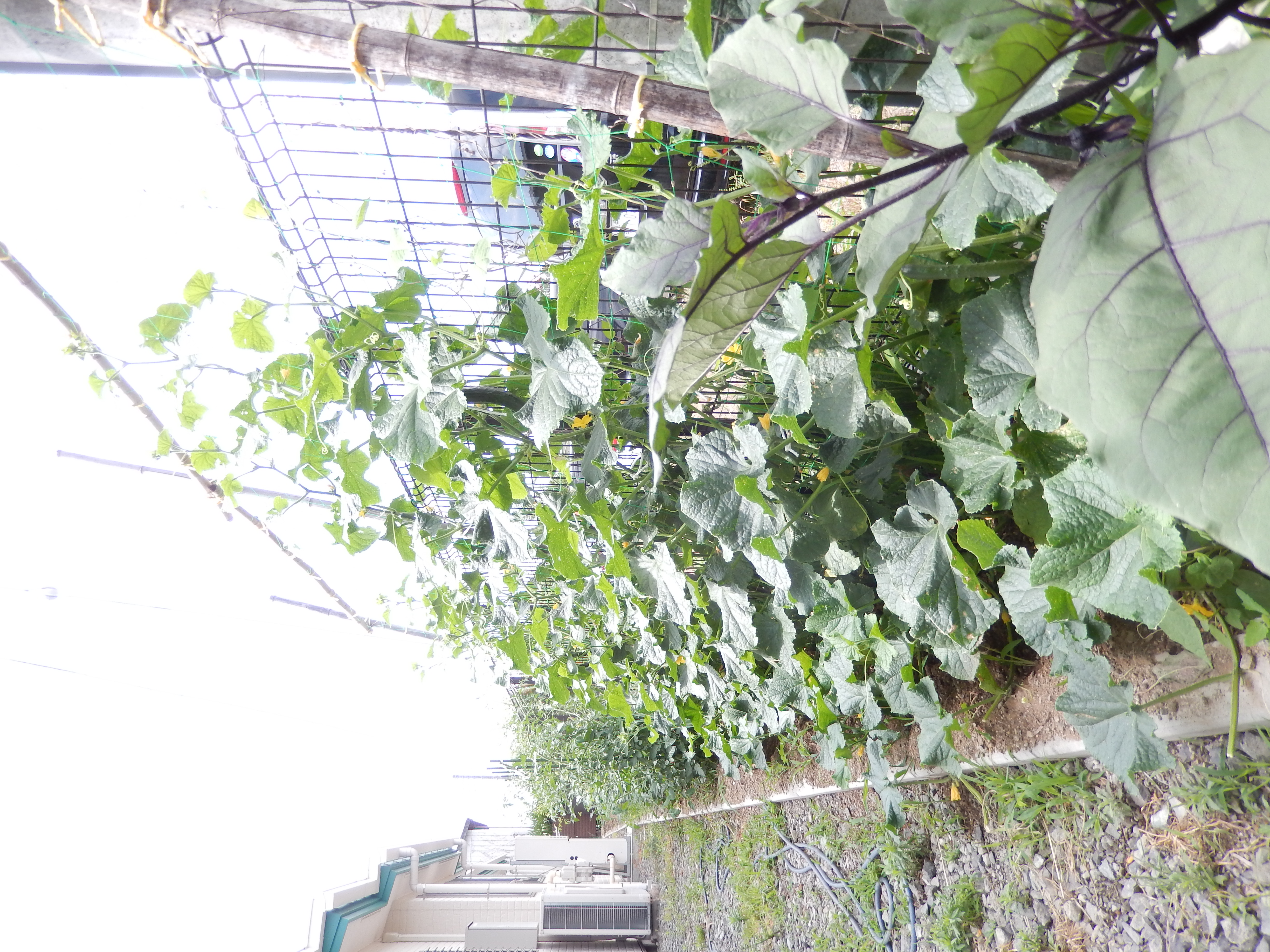 「今日のお昼に食べるように」と職員の金丸さんが立派なキュウリや茄子を収穫をしていました。