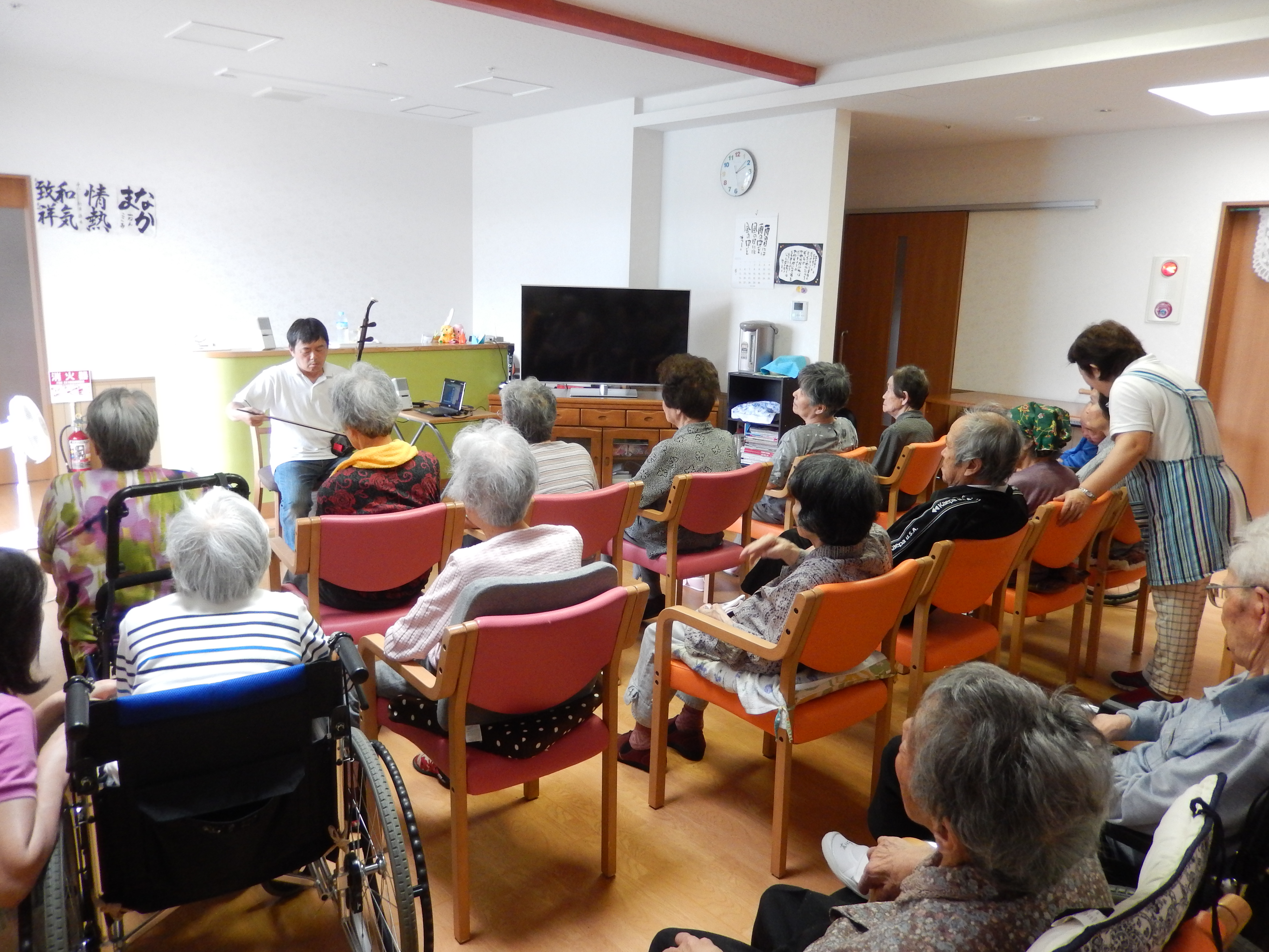 お題は「懐メロ&童謡」で、利用者の皆さんは、口ずさんで歌ったり、手でリズムを取ったり、普段は落ち着かない利用者様も椅子に座って、最後まで真剣に聴き入っていました。